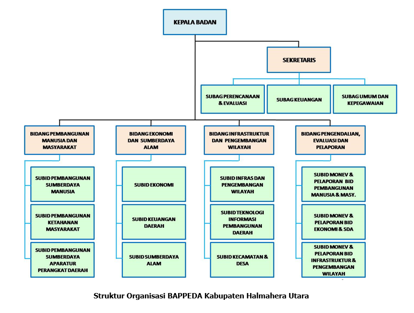 Untuk menunjang kinerja Pemerintah Kabupaten Halmahera Utara, maka dibentuk beberapa organisasi perangkat daerah (Badan, Dinas, Kantor dan Bagian), diantaranya adalah Badan Perencanaan Pembangunan Daerah (BAPPEDA) Kabupaten Halmahera Utara sesuai dengan Peraturan Daerah Kabupaten Halmahera Utara Nomor 8 Tahun 2016 tentang Pembentukan dan Susunan Perangkat Daerah Kabupaten Halmahera Utara, Bappeda terdiri Sekretariat dan 4 (empat) bidang : 3 (tiga) bidang Perencanaan yakni bidang ekonomi dan sumberdaya alam, bidang Sumberdaya Manusia, bidang Infrastruktur dan Pengembangan Wilayah serta 1 (satu) bidang Pengendalian dan Evaluasi yang masing-masing membawahi 3 (tiga) Sub bidang/Jabatan Fungsional.
